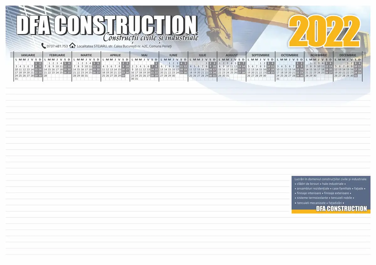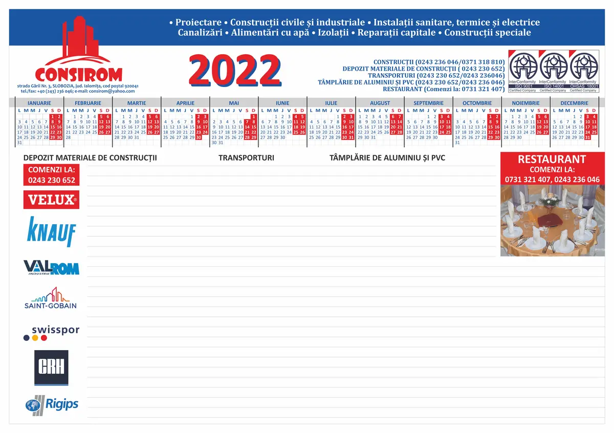 Format 32×45 cm, 12–13 file tipărite pe carton dublu cretat lucios 150 gsm. Aplicare perforații, spiră metalică, agățătoare sau capac.